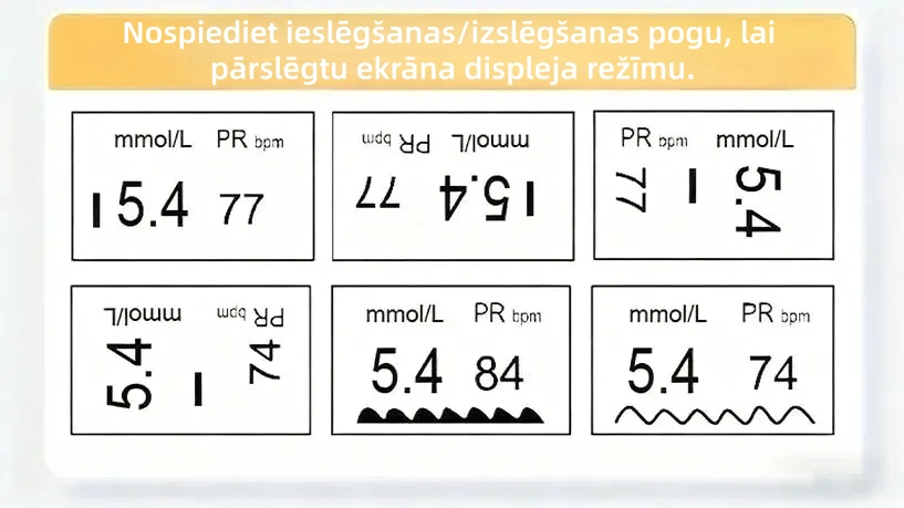 Pēc ieslēgšanas Omron™ ierīce automātiski pārslēdz displeja režīmus katru reizi, kad nospiežat ieslēgšanas/izslēgšanas pogu, ļaujot nolasīt mērījumu rezultātus no jebkura leņķa.