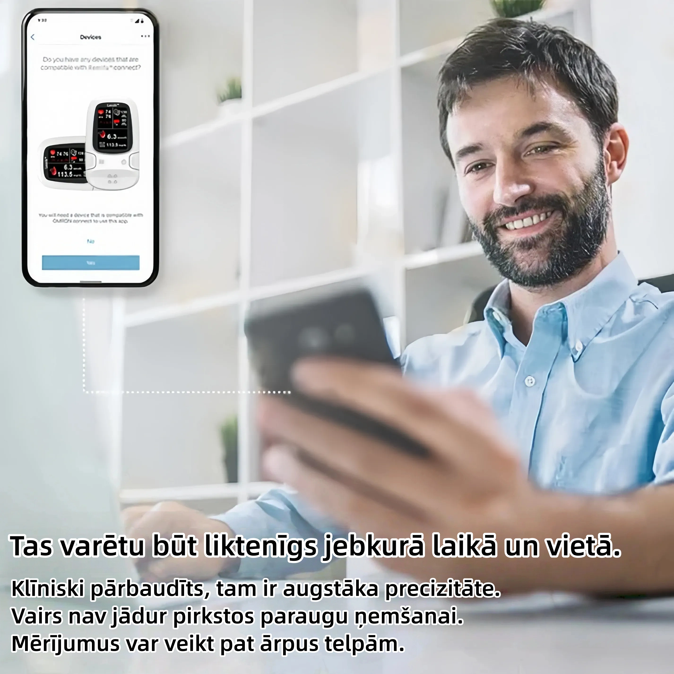Neinvazīva, bezdūrienu tehnoloģija — mēriet nesāpīgi jebkurā laikā un vietā.