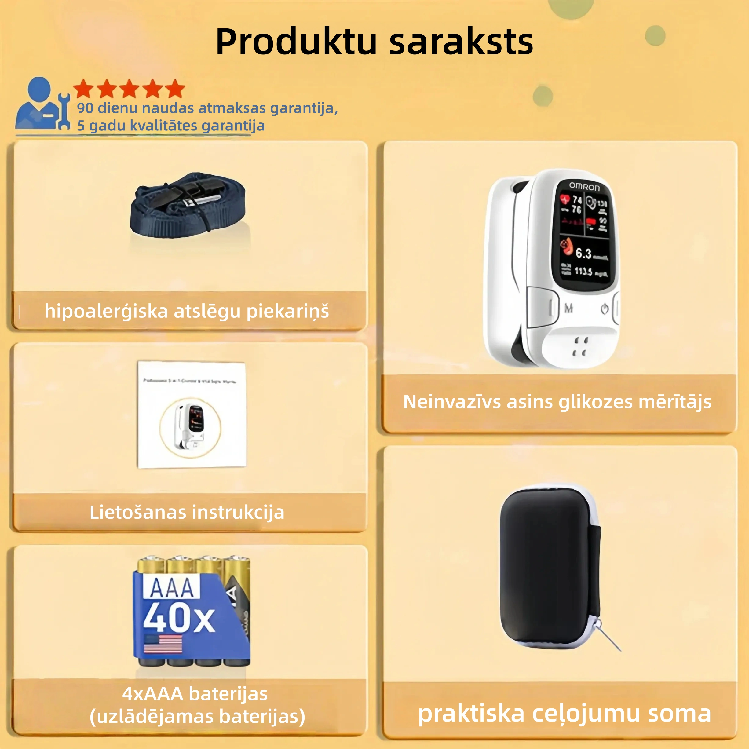 Omron™ asins glikozes mērītāji izmanto modernu FDA apstiprinātu tehnoloģiju, kas nodrošina ātrus un uzticamus mērījumus ar precizitāti līdz 99,9%. Droši un ērti kontrolējiet savu cukura līmeni asinīs, lai kur jūs atrastos — atvadieties no invazīvām procedūrām un sāpīgiem pirksta dūrieniem!
