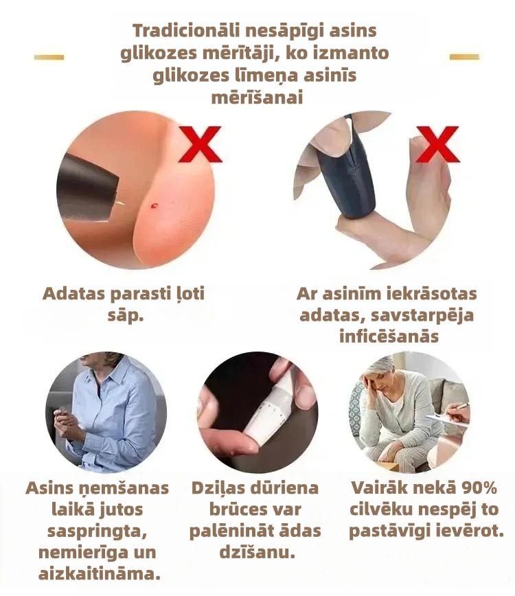 Vairs nekādas invazīvas un riskantas glikozes līmeņa asinīs pārbaudes! Droši pārbaudiet glikozes līmeni asinīs, izvairoties no savstarpējas inficēšanās un pirksta dūrienu riska.